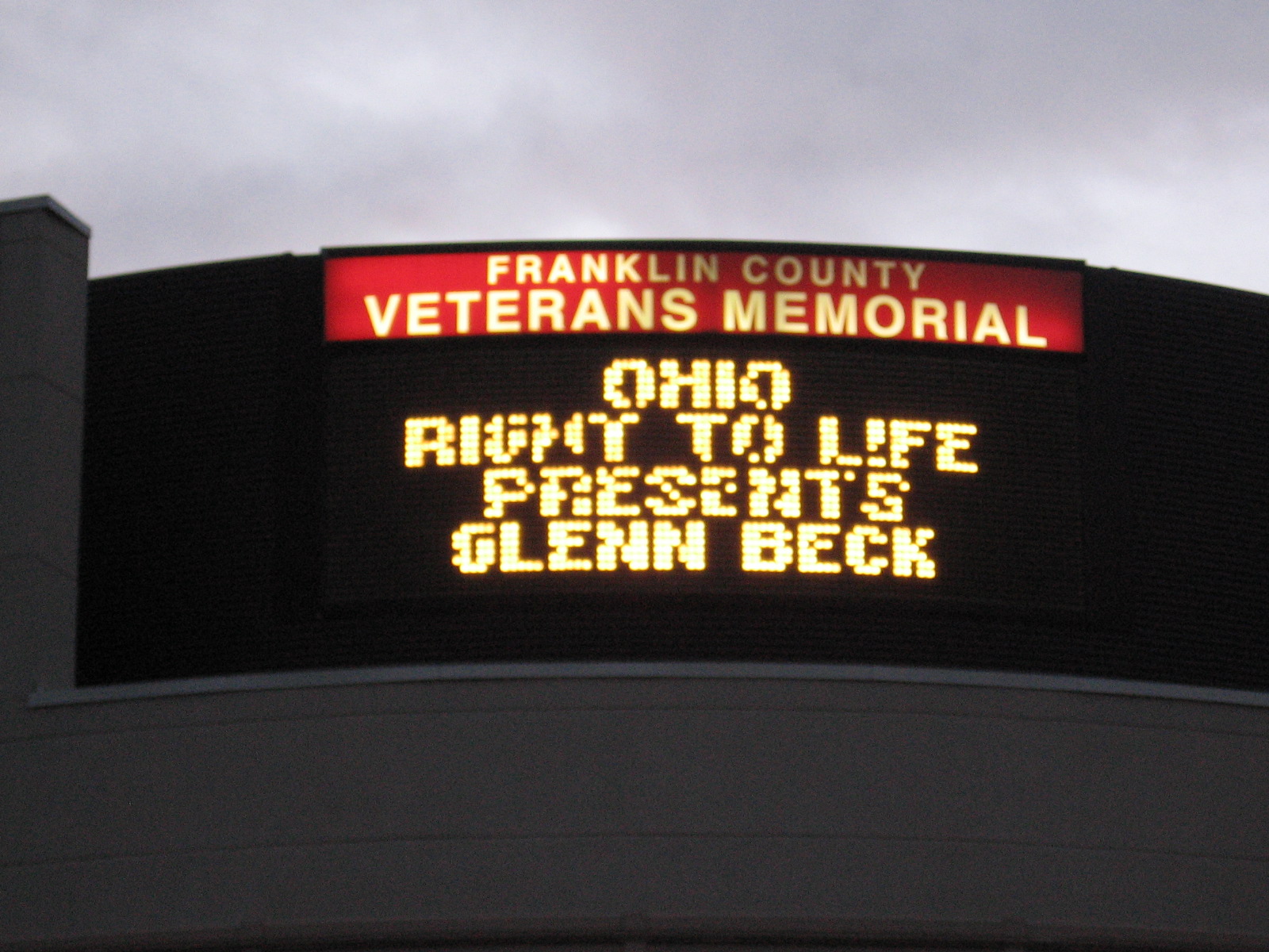 Thursday night (October 27) I attended Glenn Beck’s performance piece at Vets Memorial. His appearance was sponsored by Ohio Right to Life to kick off its annual state conference and fill its operating budget (according to Beck) for next fiscal year. Just buying a ticket wasn’t good enough. In a word of faith moment, Beck ordered us to pull out the donation envelopes from our programs and hold them tight for the next couple hours as he inspired us to stuff them with cash, check or credit card number. From the looks of the beg buckets held by ORTL volunteers standing beneath the exit signs when it was all over, Beck had indeed miraculously turned envelopes into cash.