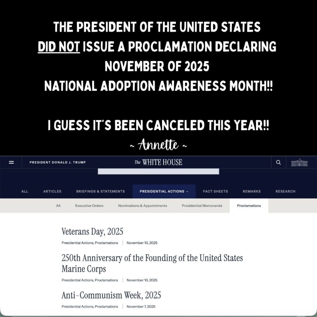 The absence of the Presidential Proclamation came up a few days ago on some FB forums. I figured Trump. (that is, an office lacky in a short short skirt) might be holding it up for a few days. Other presidents have not been with-it, but even those latecomers posted it by the end of the first week. Is he waiting for National Adoption Day next Saturday? Probably not. Or is he holding it up to make a bilgy TruthSocial announcement that he’s adopting a newborn blond-blue-eyed mini-him this month? Don’t laugh! During the Clinton administration, Hillary spaced out and said that she and Bill might adopt after he left office.